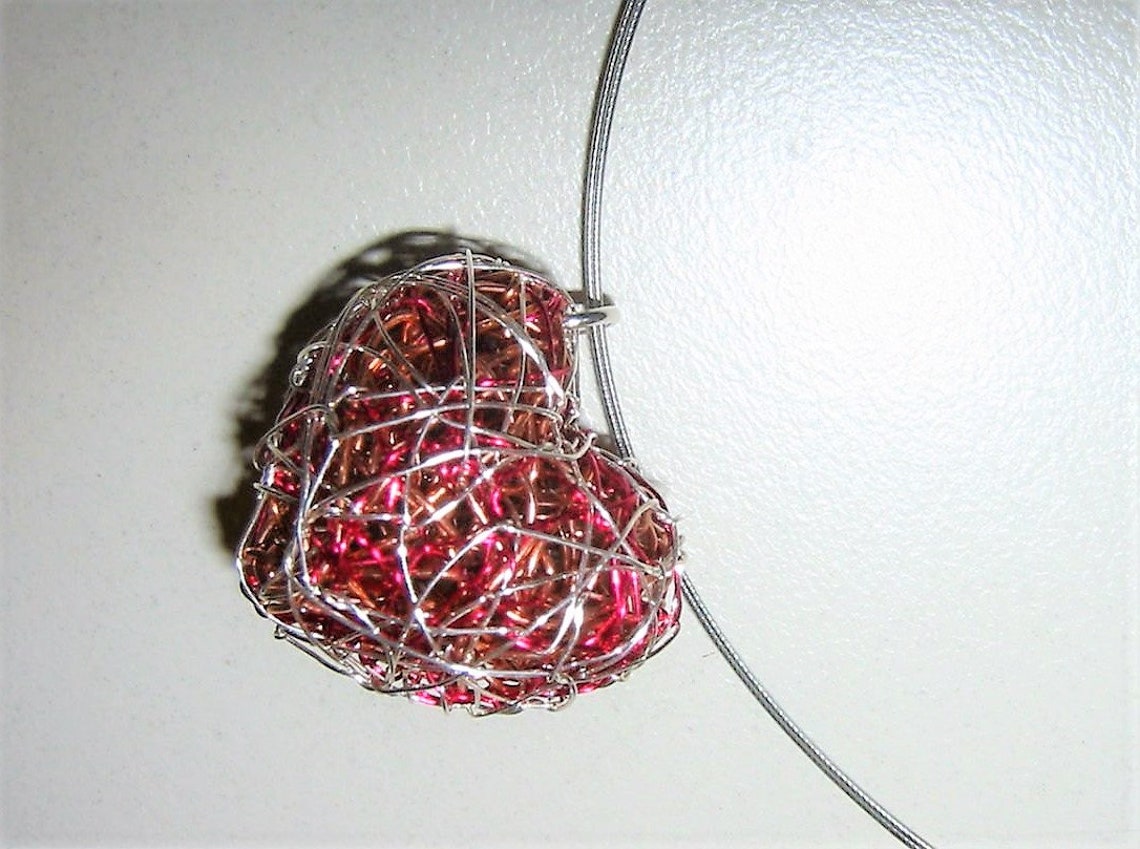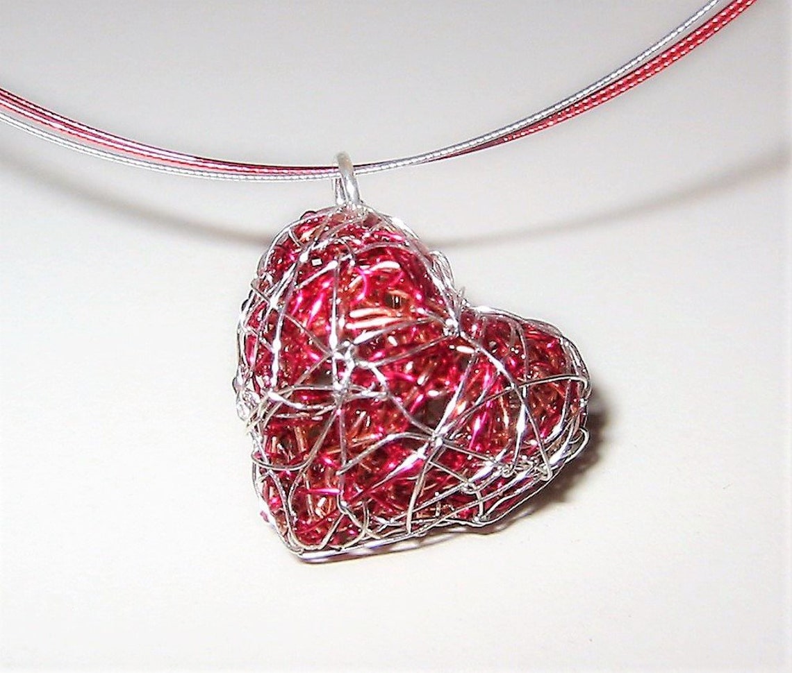 Red heart necklace, sculpture wire art jewelry handmade of colored copper wire and silver.