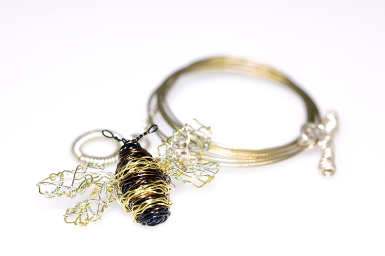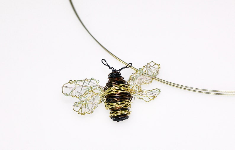 Gold Bee necklace, sculpture art jewelry handmade of colored copper wire and silver.